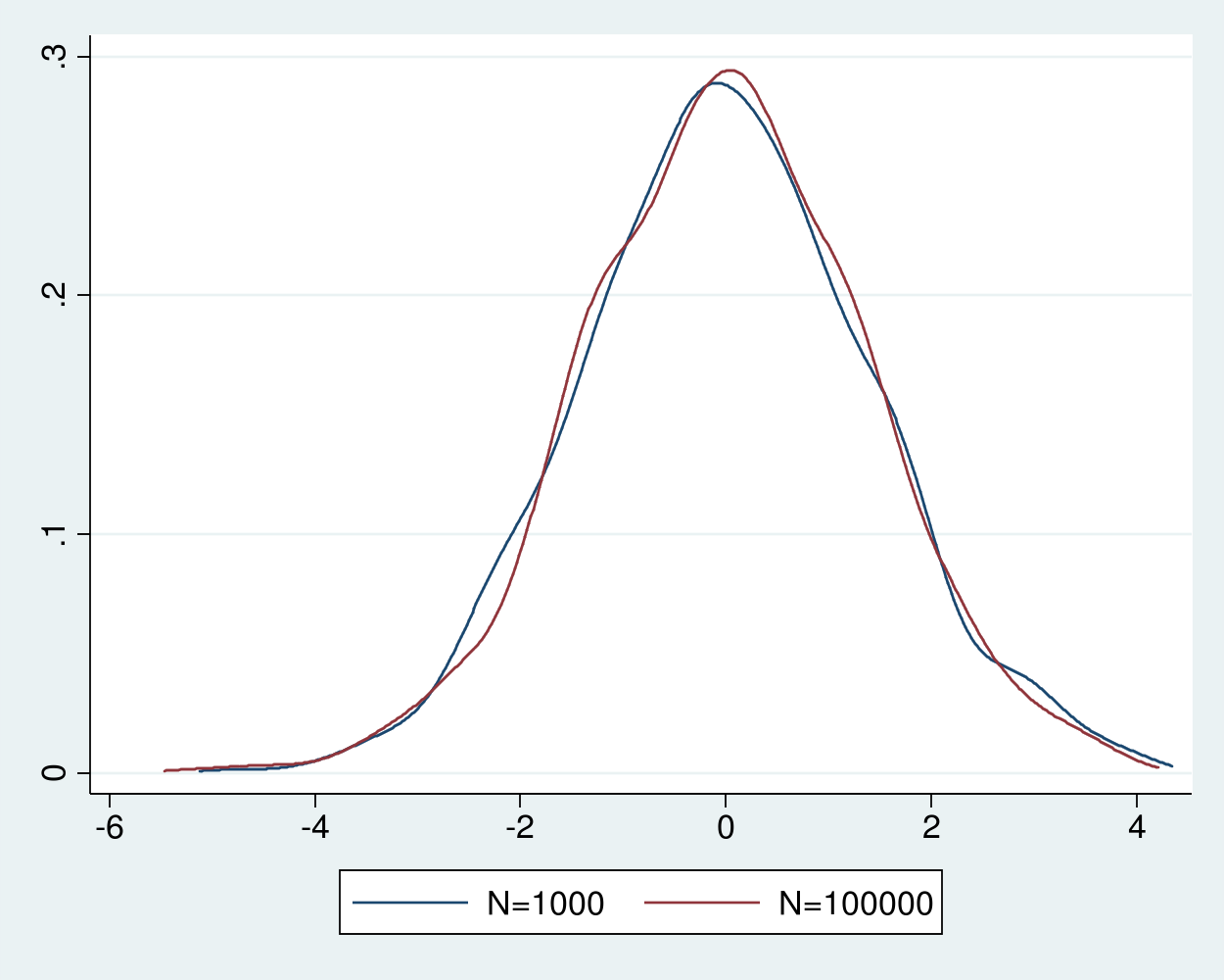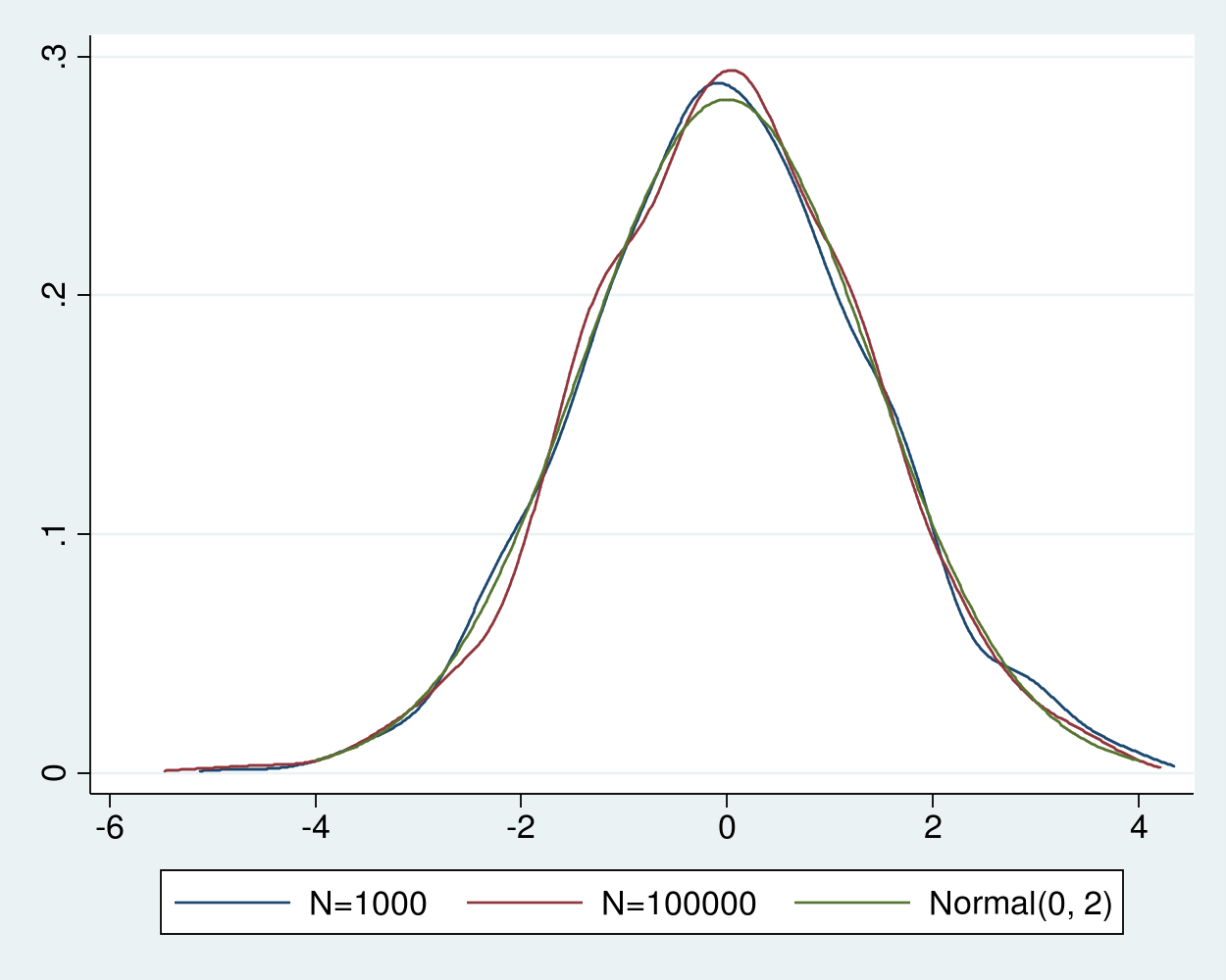 1twoway (line f_1000n x_1000n) (line f_100000n x_100000n) (function normalden(x, sqrt(2)), range(-4 4)), legend( label(3 "Normal(0, 2)") cols(3))
