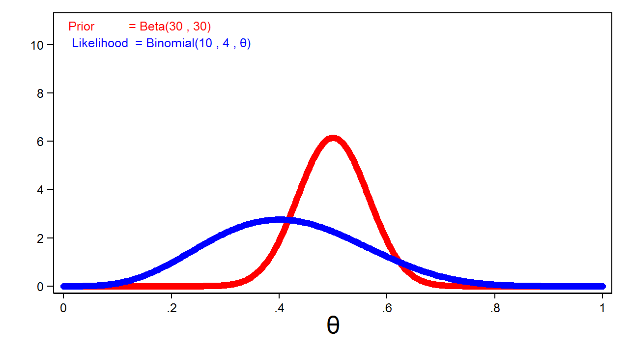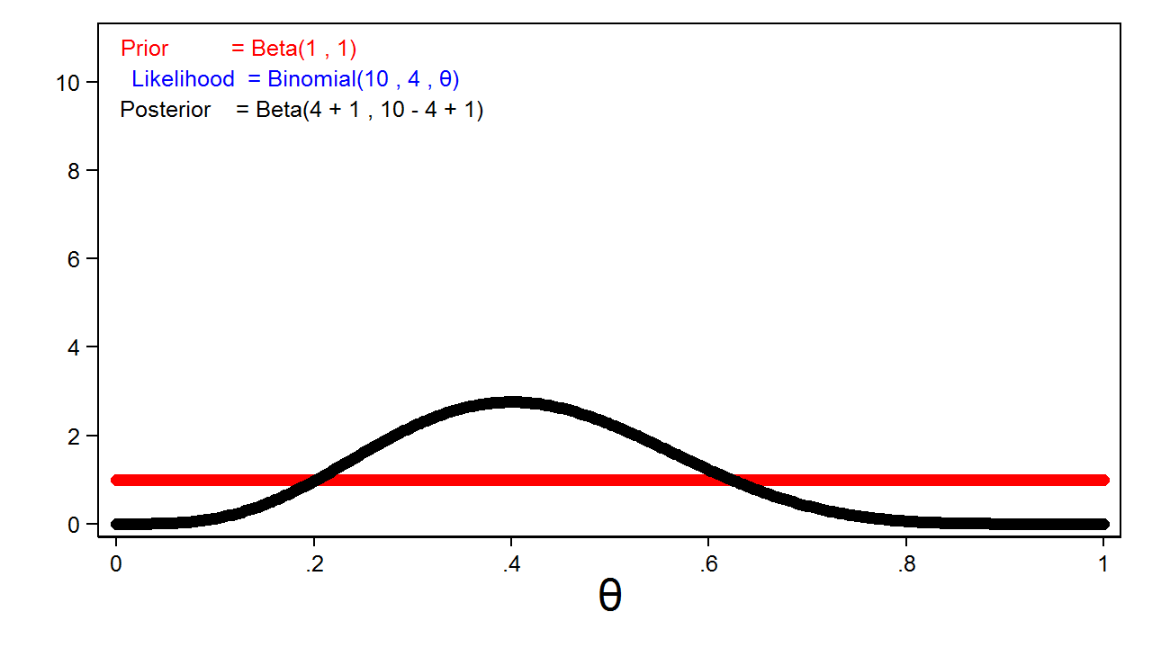 Phân phối xác suất nhị thức thường được dùng để tính số lần thành công trong một số lần thử cố định. Ở đây, tôi có thể định lượng kết quả thí nghiệm bằng hàm hợp lý nhị thức cho tham số theta khi có 4 lần mặt ngửa trong 10 lần tung.