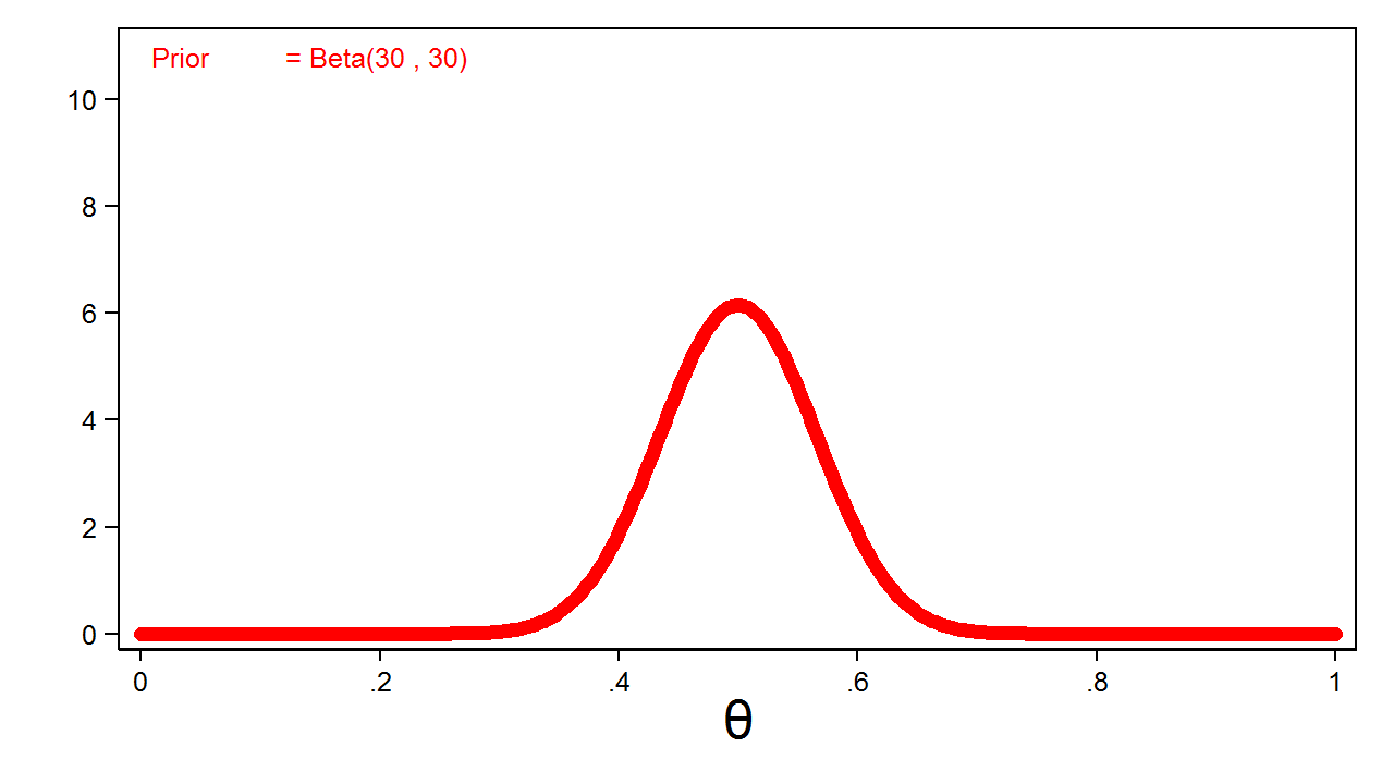 Tuy nhiên, kinh nghiệm thông thường cho thấy xác suất mặt ngửa sẽ gần mức 0.5. Tôi có thể diễn đạt niềm tin này bằng cách tăng các tham số của phân phối beta. Hình 2 hiển thị phân phối beta với các tham số là 30 và 30.