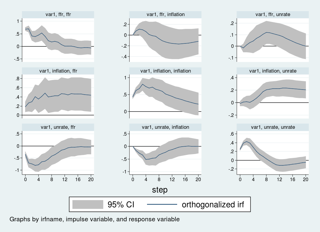 Trong ví dụ này, trình tự được áp dụng lần lượt là lạm phát, tỷ lệ thất nghiệp và lãi suất. Sau khi định nghĩa luồng dữ liệu, thao tác tạo đồ thị hàm phản ứng đẩy trực giao được thực hiện trơn tru bằng cú pháp irf create và irf graph.