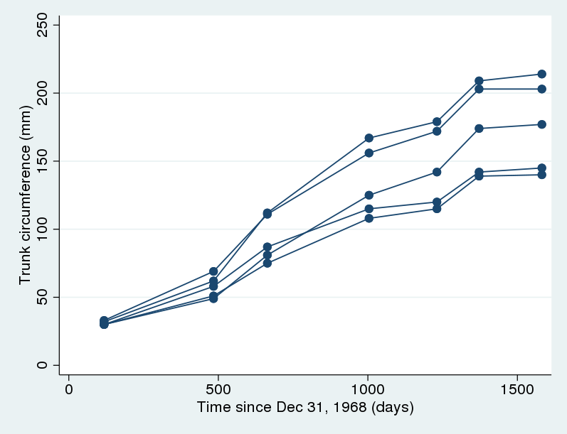 Chúng ta sẽ phân tích một bộ dữ liệu về chu vi thân của năm cây cam khác nhau. Dữ liệu này đo lường chu vi thân cây tính bằng milimet trong bảy thời điểm khác nhau, trải dài trong khoảng thời gian sinh trưởng chừng bốn năm. Mục tiêu là lập mô hình tăng trưởng của những cây cam này. Trước tiên, hãy vẽ biểu đồ dữ liệu để có cái nhìn trực quan.