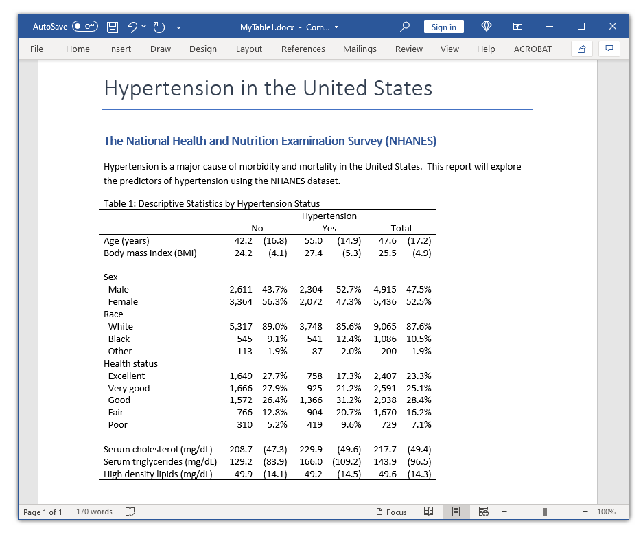 6collect style putdocx, layout(autofitcontents) title("Table 1: Descriptive Statistics by Hypertension Status")