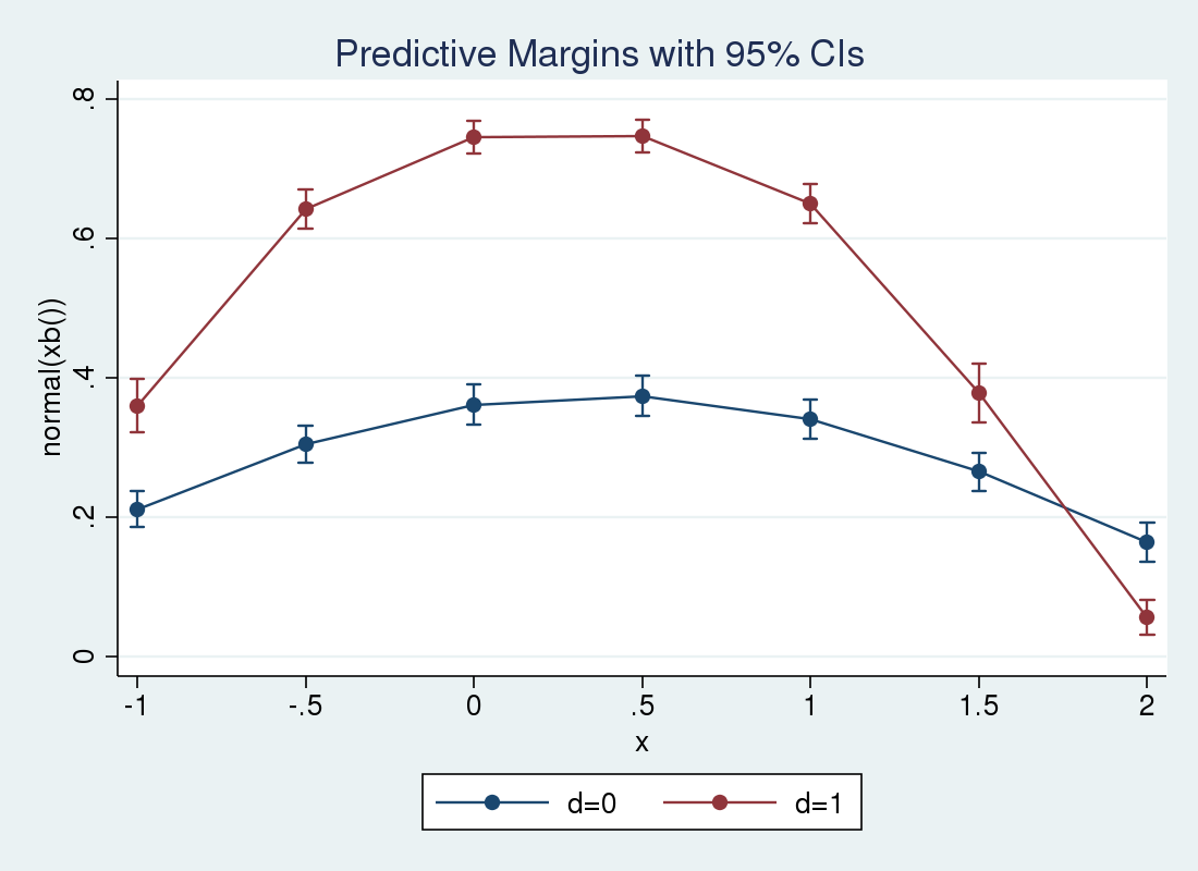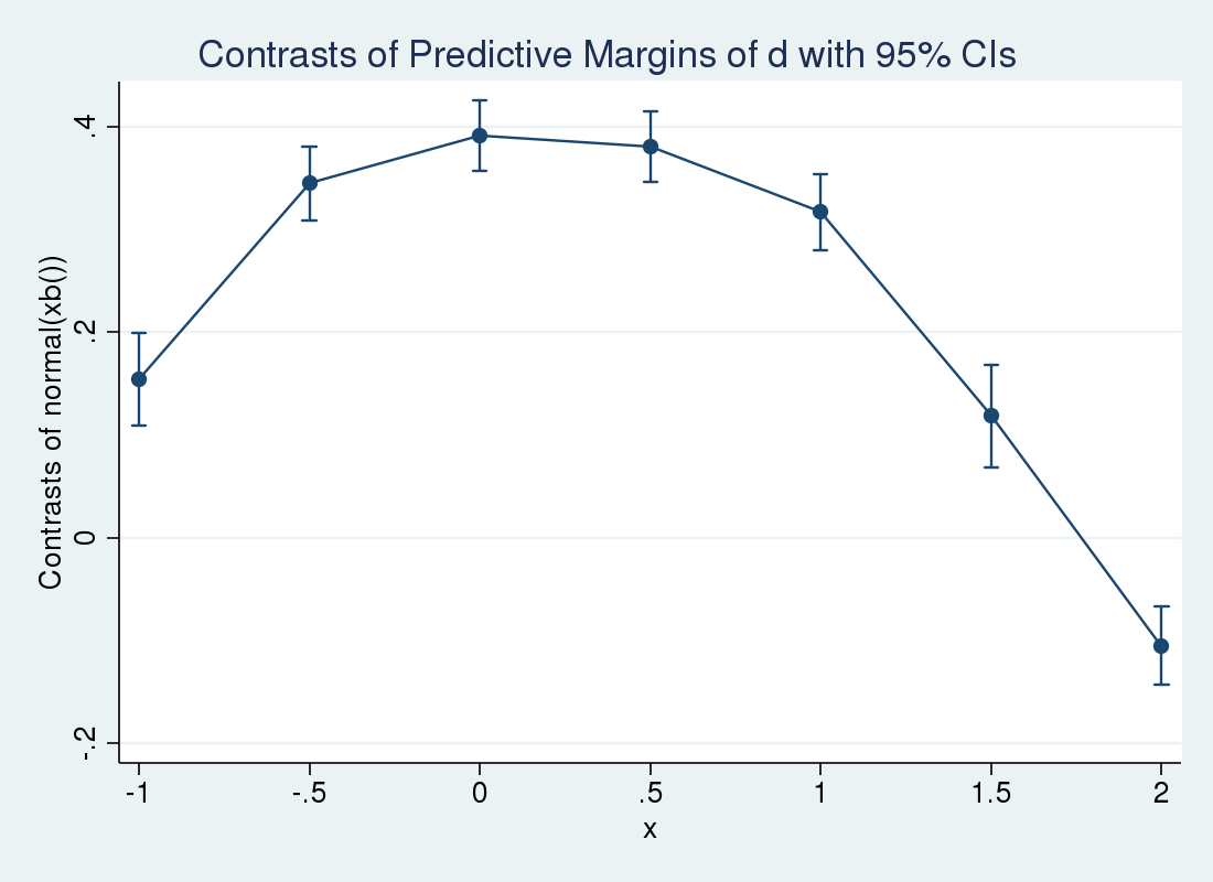 1. margins, at(x = (-1 -.5 0 .5 1 1.5 2)) over(d)